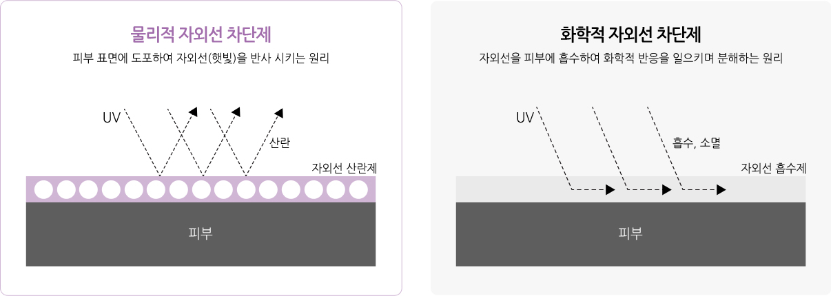 물리적인 작용에 의하여 자외선 을 반사, 산란시키는 자외선 차단 성분인 징크옥사이드와 티타늄디옥사이드가 함유된 물리적 자외선차단제로 분 말 상태인 안료를 이용하여 자외선과 가시광선을 분산시 켜 피부 침투를 막아냅니다1.화학적 자외선 차단제